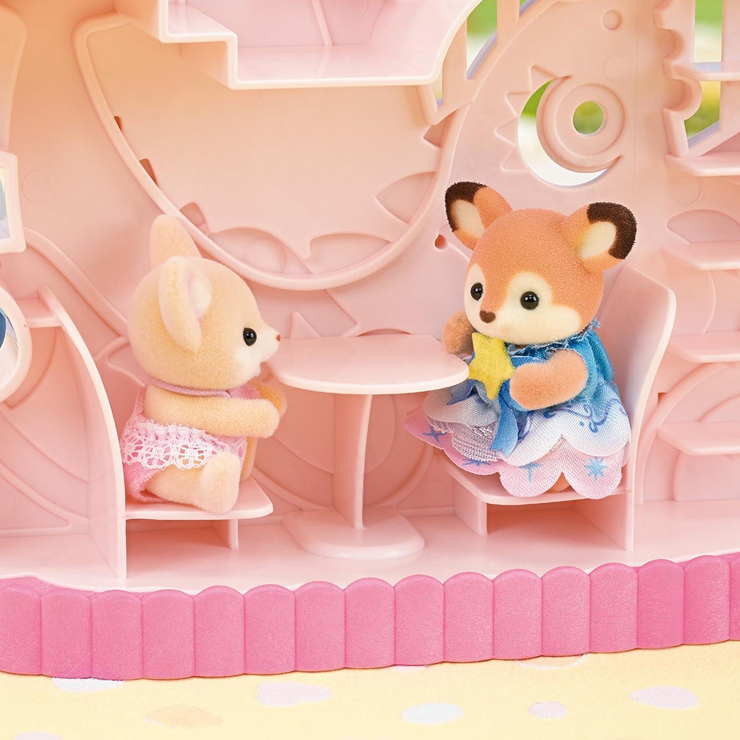 Calico Critters Baby Dream Amusement Park brings whimsical design and vibrant fun to Calico Land! Baby Amusement Park Series is a ready to play amusement park playset for baby figures which features mechanical rides for the babies to enjoy! Set includes 1 poseable twin baby figure, Chocolate Rabbit Baby named Crème. Five main amusement park attractions for babies to ride including the rotating Ferris Wheel with three gondolas, rocking Pirate Ship, Rocketship, Flying Train and Carriage. Features space for up to 30 Calico Critters babies figures. Play together with other amusement park playsets and figures including Baby Star Carousel, Royal Carriage, Fantastical Fairytale Friends and more!
